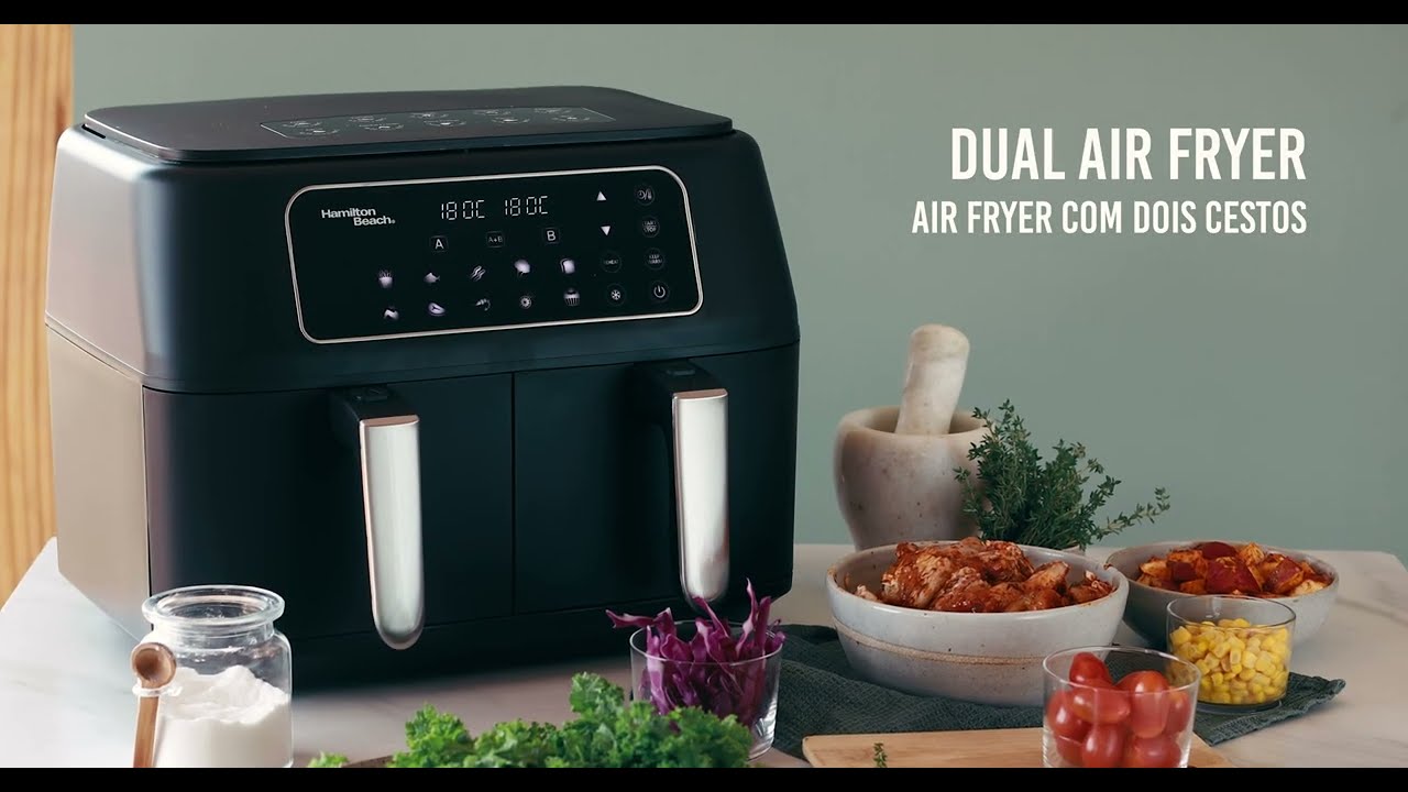 Descubra a Air Fryer Digital Duas Cestas da Hamilton Beach, a solução ideal para facilitar suas refeições! São duas air fryers em uma! Com um painel digital inteligente e 12 funções pré-programadas, você poderá cozinhar com apenas um toque uma variedade de pratos deliciosos, como batatas fritas, torradas, vegetais, camarão, carnes, frango, peixes e até bolos.